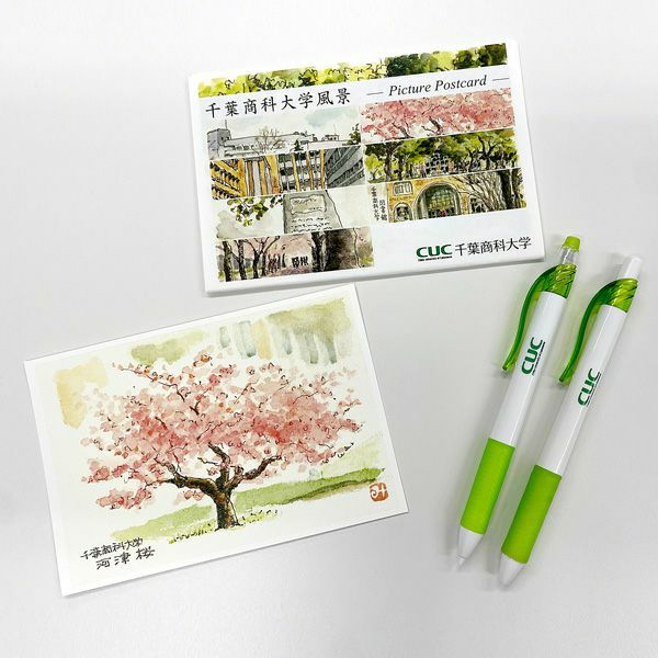 千葉県市川市在住の「放浪のお絵描きおじさん」こと百田稔氏による千葉商科大学構内風景の絵葉書と大学のロゴがプリントされたボールペン/シャープペンシルのセットです。