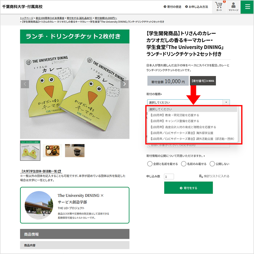 項目「寄付の種類 *」の【↓】をクリックし、寄付の使途を決定してください。