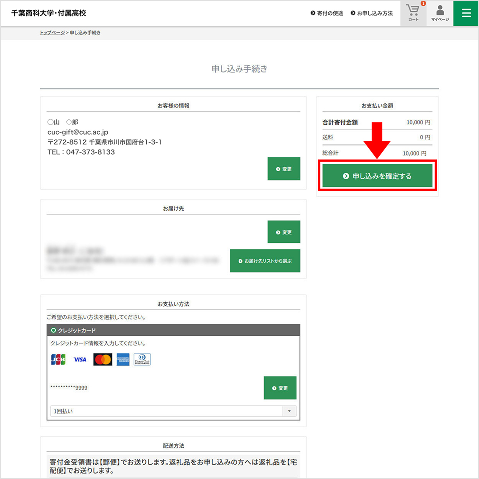 「お客様の情報」「お届け先」「お申し込み内容」をご確認の上、クレジットカード決済のお手続きをお願いします。